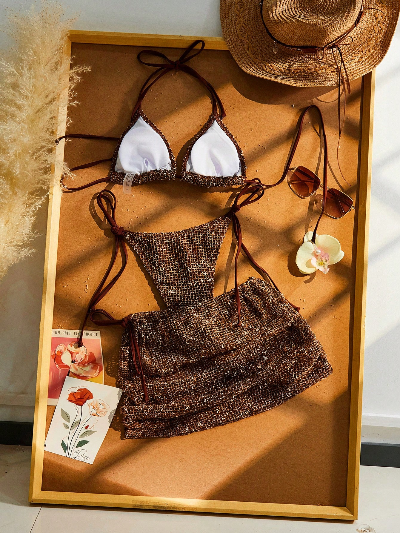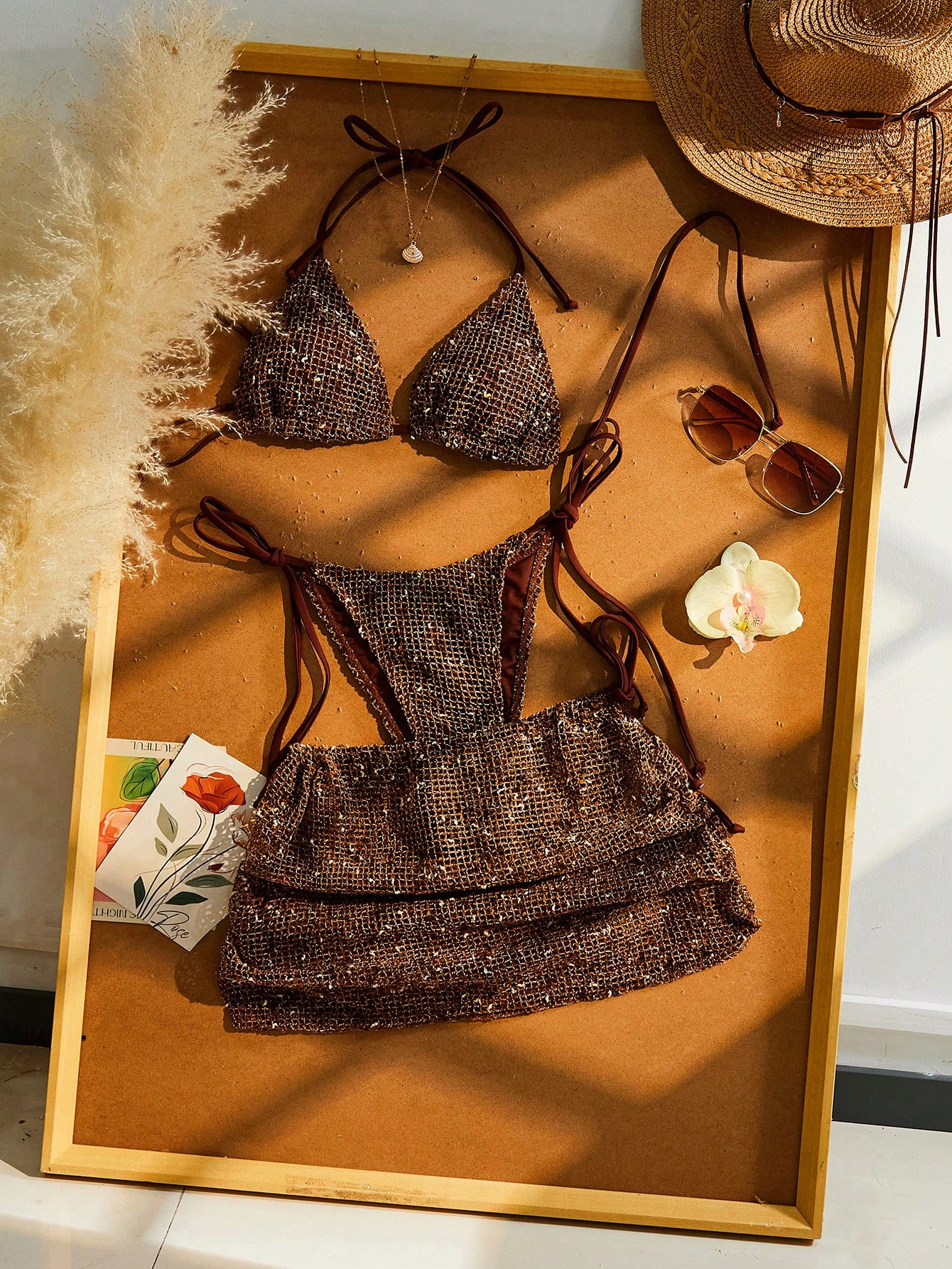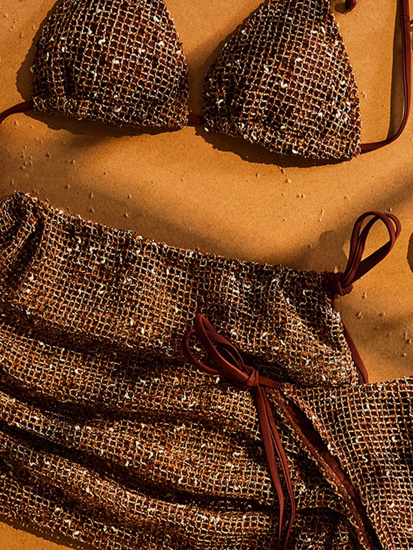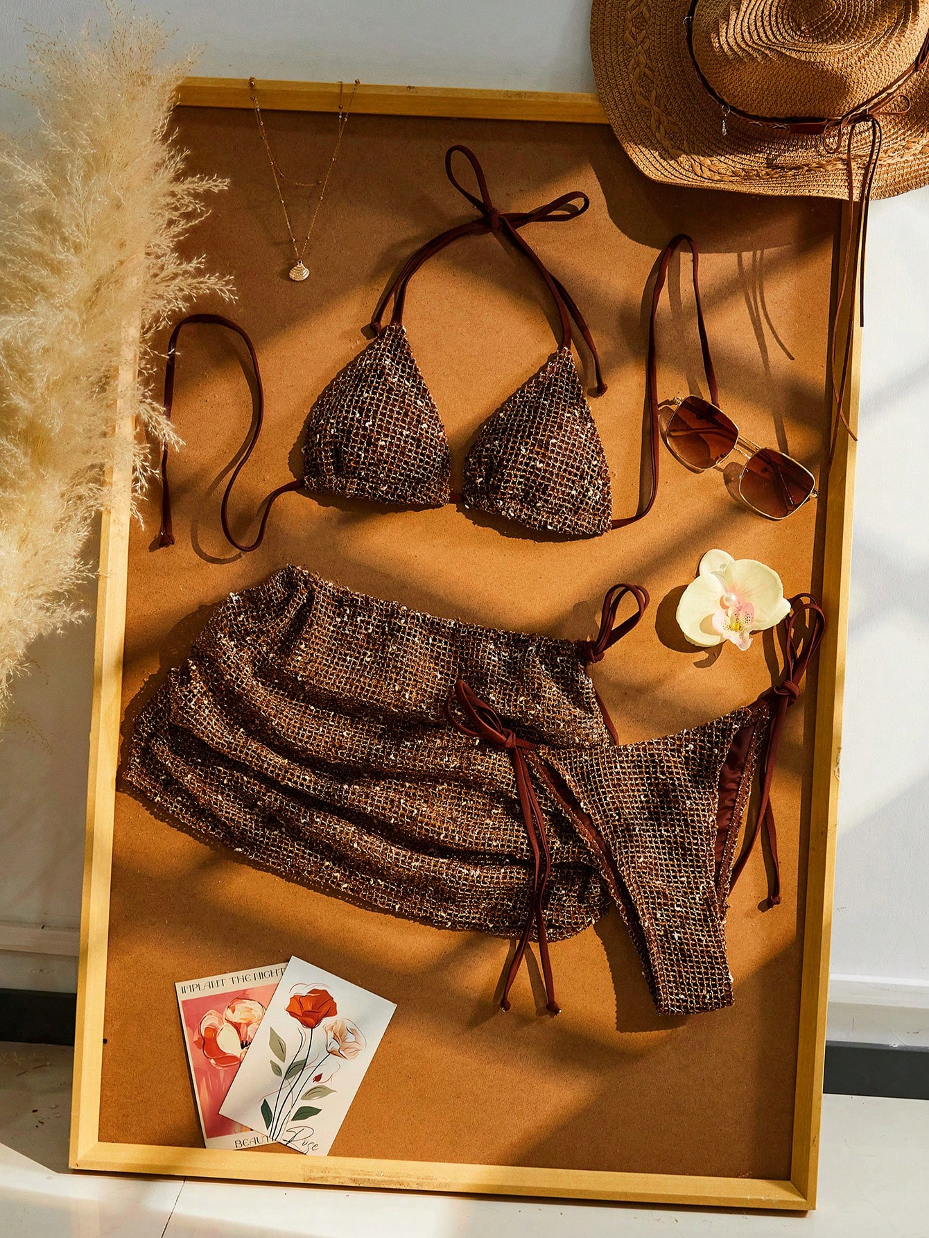 Bohemian Sequin Crochet Halter Tie Back Bikini Set With Cover Up