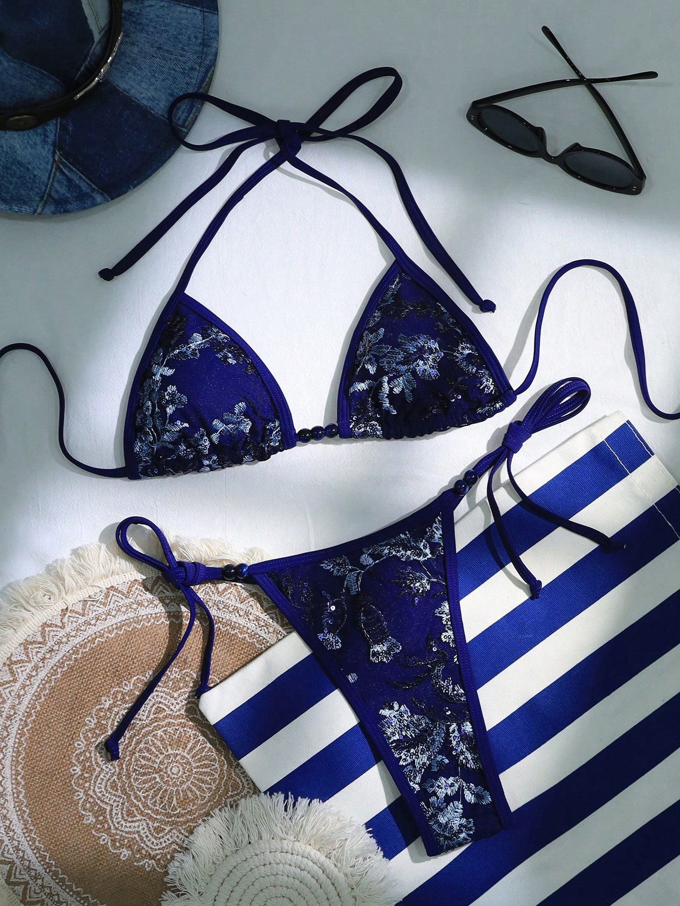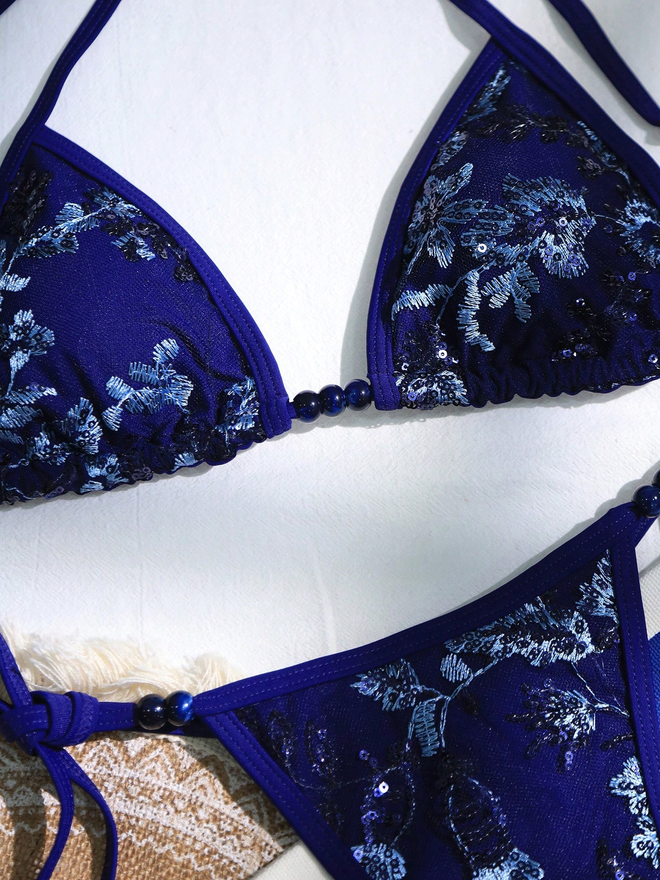 Navy Blue Sequin Embroidery Lace Up Halter Tie Side Thong Bikini Set