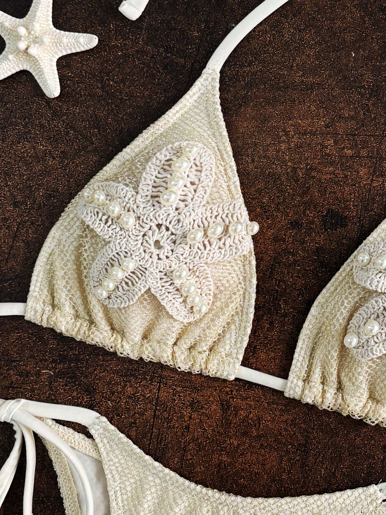 2-piece set with hand-crocheted fabric, pearl embellished flower detail on halter triangle top