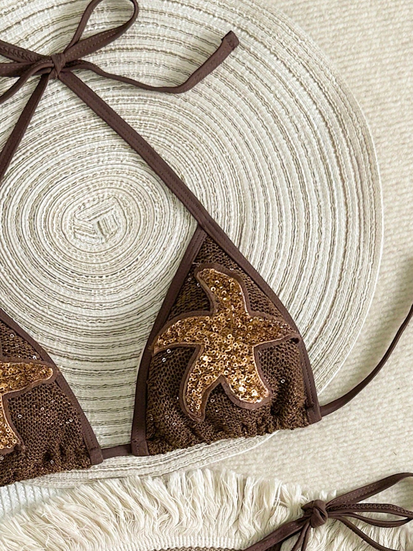 2-piece set with coffee brown base color, sequin starfish graphic embellished on halter triangle top