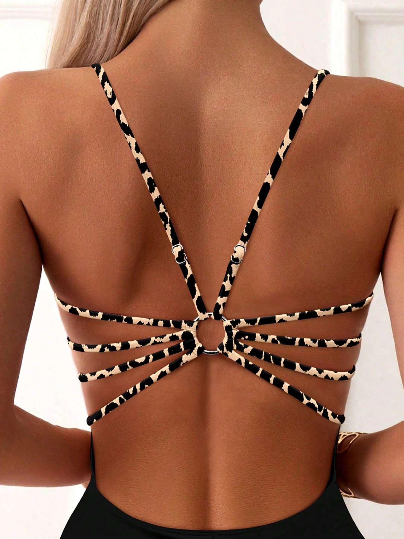 Solid black base with leopard print strap detail for a stylish look;